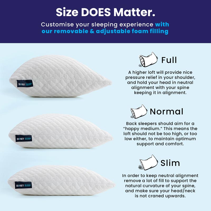Our Sidney Sleep pillows are filled with shredded memory foam making them fully adjustable. To do this, just open the zipper on the inner lining and add or remove as much fill as you need to match your sleeping style and support needs. Here's what we recommend: