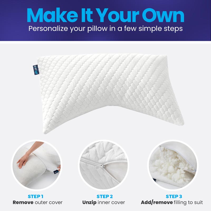 Different sleep positions require different support systems, and now one pillow can provide you with personalized support. Simply unzip the pillow’s inner lining and effortlessly add and remove shredded memory foam to create the ideal sleeping support that is customized for YOU.